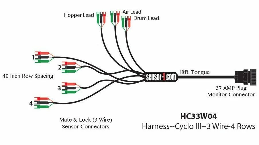 - 4 Row Planter Harness with 37 Pin Cyclo III Monitor Connector and 3 Wire Mate-and-Lock Amp Ends-4 to 8 Row Harnesses get 1 Hopper, 1 Air and 1 Drum Lead.