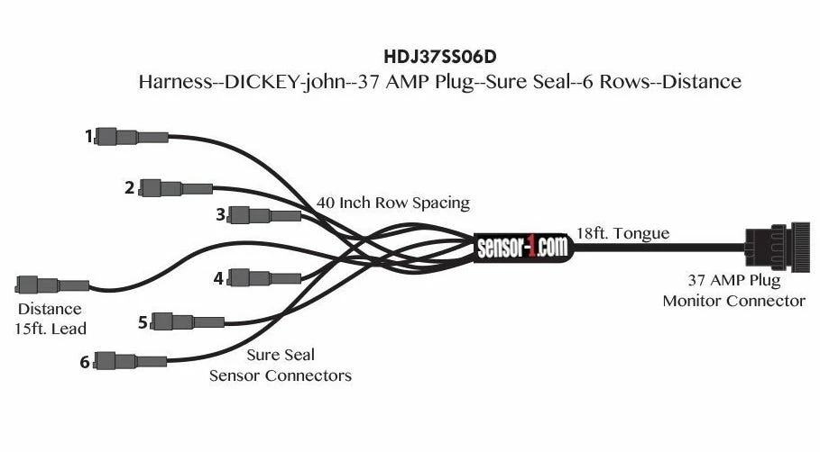 - 6-Row Planter Harness with 37 Pin Amp Monitor Plug Dickey John layout, Distance Sensor lead and Cannon Sure Seal Connectors, Made with Standard Tongue Length of 18 Ft.