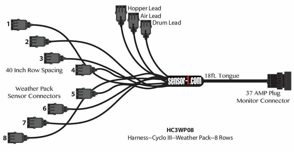 - 8 Row Planter Harness with 37 Pin Cyclo III Monitor Connector and Weather Pack Ends-4 to 8 Row Harnesses get 1 Hopper, 1 Air and 1 Drum Lead.